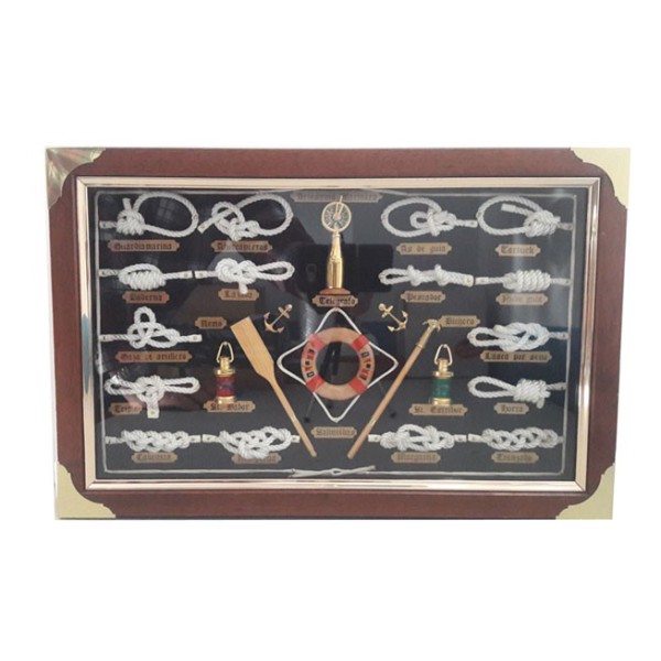 Schönes Bild mit Seemannsknoten, mit zahlreichen nautischen Elementen. Mit Holzrahmen und mit Glas geschützt. Das Seil ist aus Baumwolle. Jeder Knoten trägt eine Plakette mit seinem Namen eingraviert.