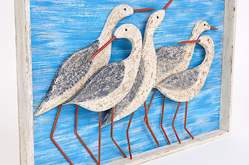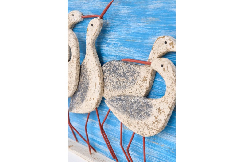 Seedekor-Bild aus Holz. Das Gemälde hebt einige Vögel im Meer hervor.