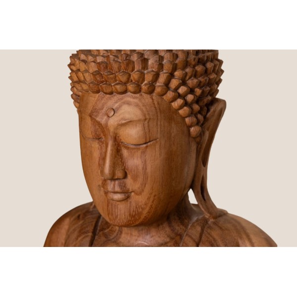 Meditierender Buddha aus Suarholz mit weißem Gewand. Handgefertigt in Indonesien, Einzelstück.