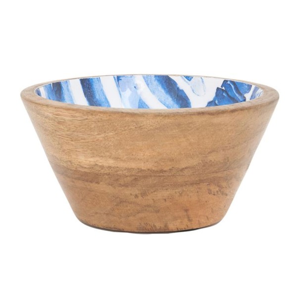 Schüssel aus emailliertem Holz mit aufgedrucktem blauem Bild.