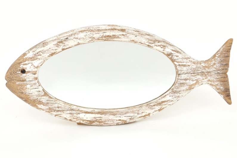 Verleihen Sie Ihrer Einrichtung mit unserem fischförmigen Spiegel einen Hauch von Vintage. Er ist aus Holz gefertigt und handbemalt mit einer antiken Patina. Dieser wunderschöne Spiegel reflektiert nicht nur Ihr Spiegelbild, sondern auch die Eleganz und den Charme des Vintage-Stils. Ein perfektes Geschenk.