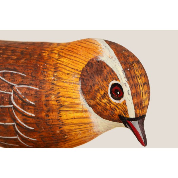 Albasia-Holzvogel der Art „Zaunkönig“ mit einem hölzernen Rumpffuß. Handgefertigt in Indonesien, Einzelstück.