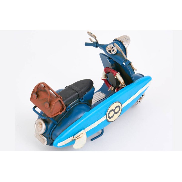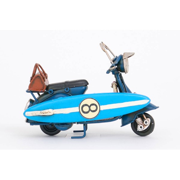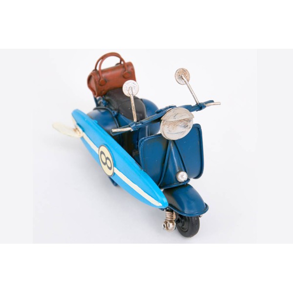 Schönes Modell eines alten Motorrads vom Typ „Vespa“ mit Surfbrett, bereit für die Fahrt zum Strand.