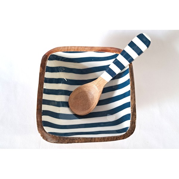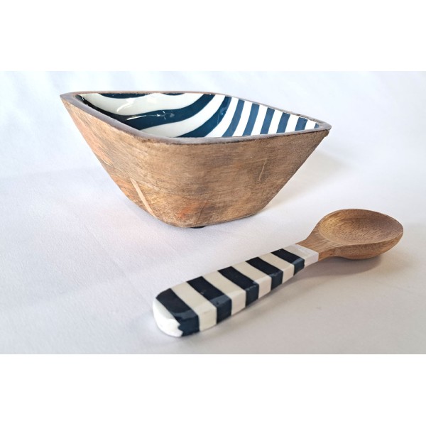 Schüssel aus emailliertem Holz, streifenbemalt, mit Löffel.