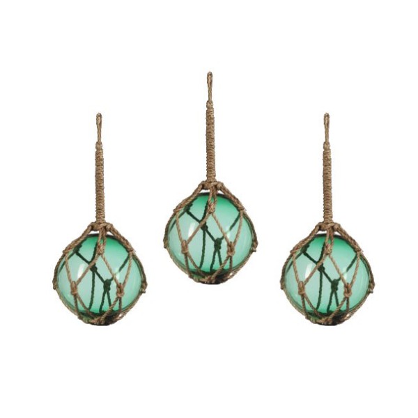 Set von 3 Fischerbojen. Die Fischer-Boje war ein alter Schwimmer bestehend aus einer Glaskugel in einem geflochtenen Seil gewickelt. Diese Schwimmer wurden bis in die 50er Jahre verwendet . Sie wurden an die Fischernetze festgemacht damit sie an der Oberfläche blieben während sie vom Strom getrieben wurden. Ein Objekt, das ein dekorativer Meeres-Touch gibt.