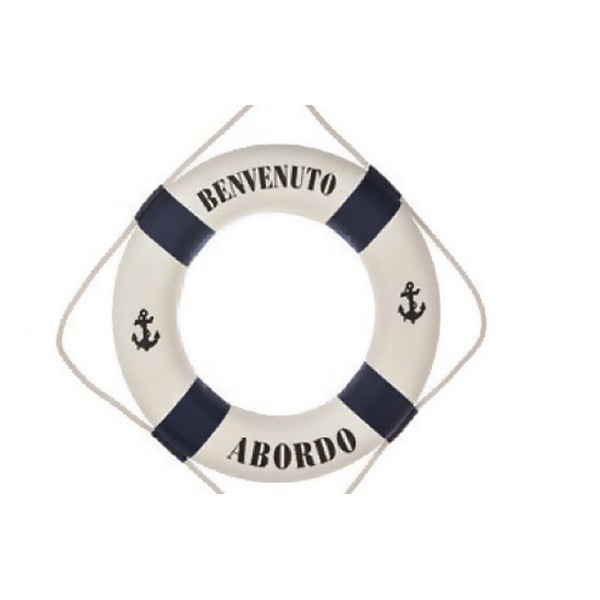Rettungsring "Bienvenido a Bordo" - "Benvenuto Abordo" umkehrbar. Exakte Nachbildung eines Rettungrings, ideal um Ihrer Einrichtung enen See-Touch zu geben. Innen aus Porexpan gemacht und mit einem Baumwollsegeltuch bedeckt. Das Seil rundherum benutzt man, um sich zu halten.