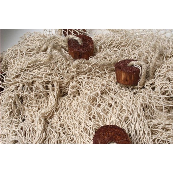Fischernetz aus Baumwolle. Die Schwimmer sind an jedem Ende mit einem Hanfseil befestigt. Ein Deko-Objekt, das Meeresstimung schafft.