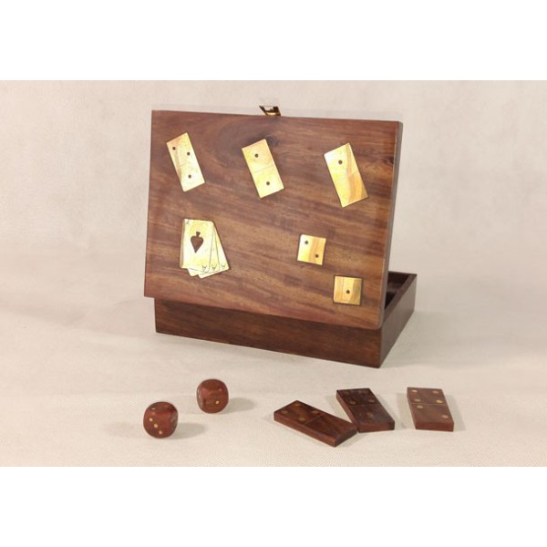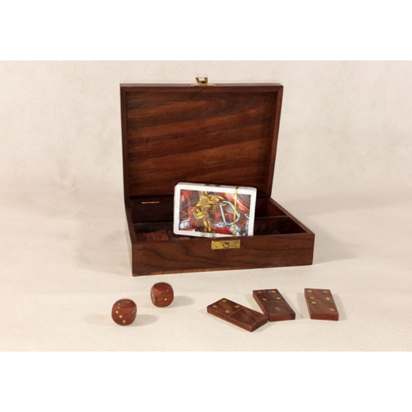 Ausgezeichneter Satz von Spielkarten, Dominos und Würfel in der Holzkiste, die mit Messing verziert wird. Ausgezeichnetes Geschenk, um viel Spass zu haben.