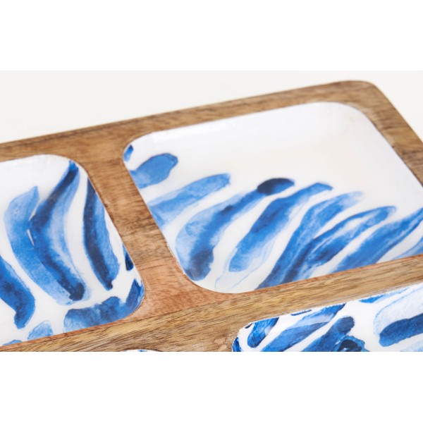 Holz- und Emailtablett mit aufgedrucktem blauem Bild.