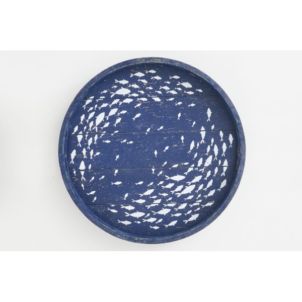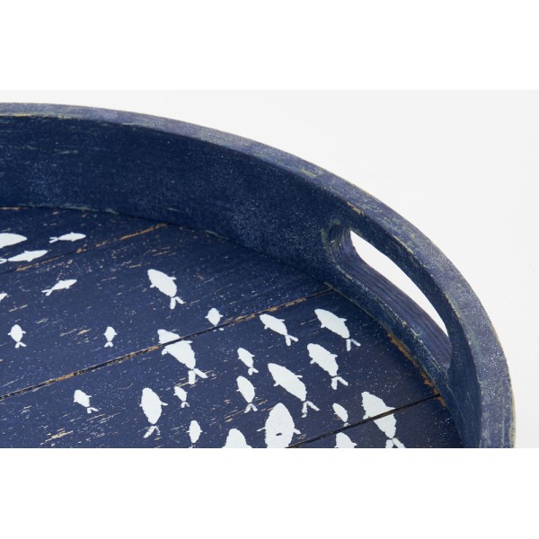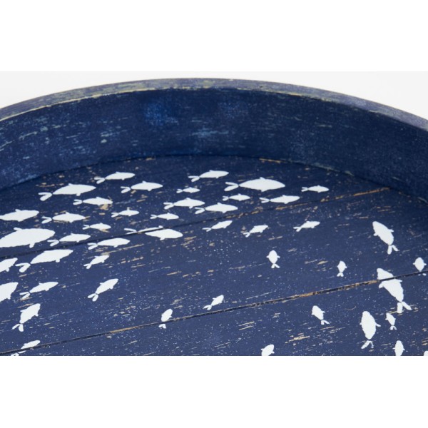 Rundes, blau lackiertes Holztablett, das alt oder antik imitiert.
