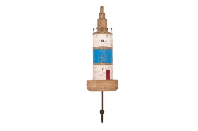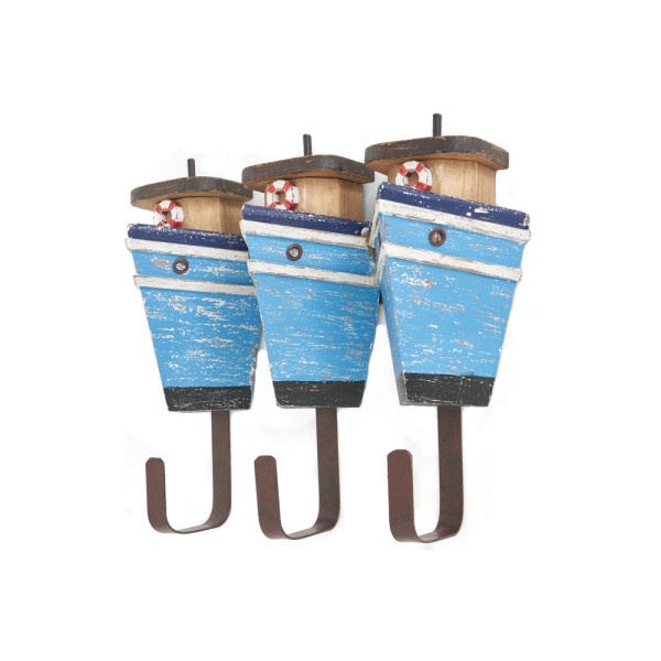 Kleideraufhänger mit Holzboot und gusseisernen Kleiderhaken.