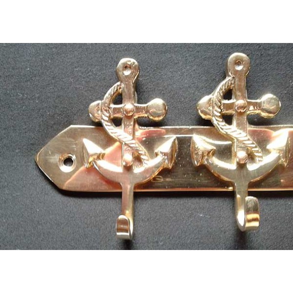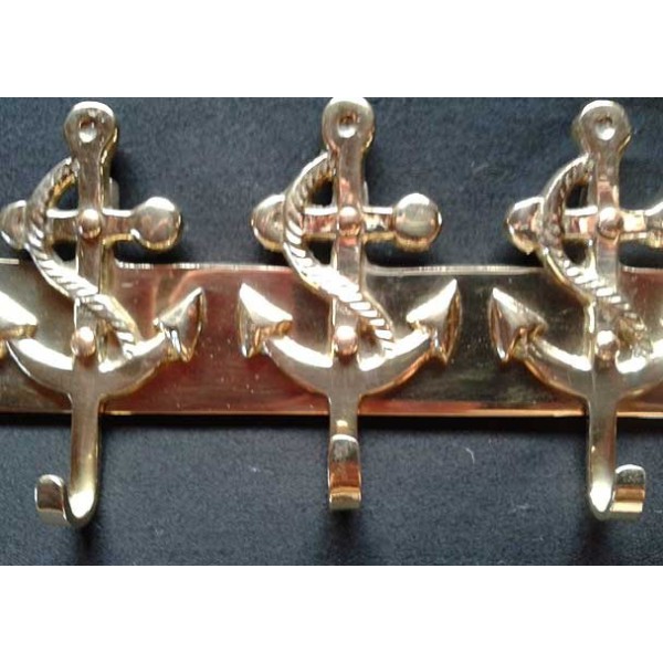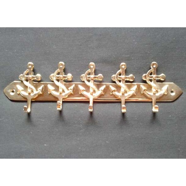 Wandhaken in Form von 5 Anker, aus hellem Messing. Es kann mit Befestigungsschrauben oder Montage-Klebstoff gehängt werden.