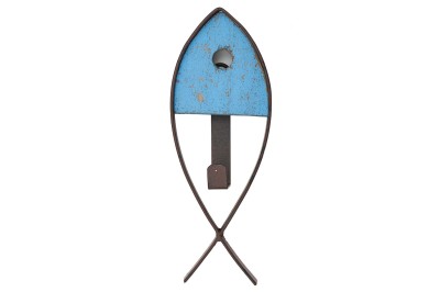 Set von 3 Wandhaken in Fischform, aus Holz und Metall. Es kann mit Befestigungsschrauben oder Montage-Klebstoff gehängt werden.