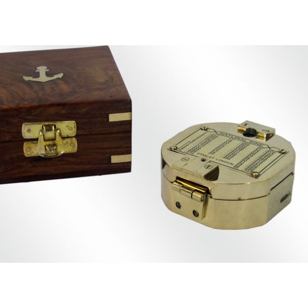 Schöne Nachbildung eines Brunton shiff Kompass, aus glänzendem Messing. Dazu gehört eine Holzkiste, auf der Innenseite ausgekleidet, mit einem Ankerdekor. Der Durchmesser des Kompasses beträgt 8 cm. Es funktioniert perfekt, obwohl seine Verwendung rein dekorativ sein sollte Geschichte Shiff Kompass