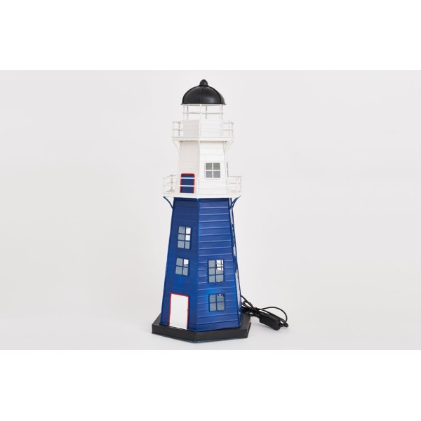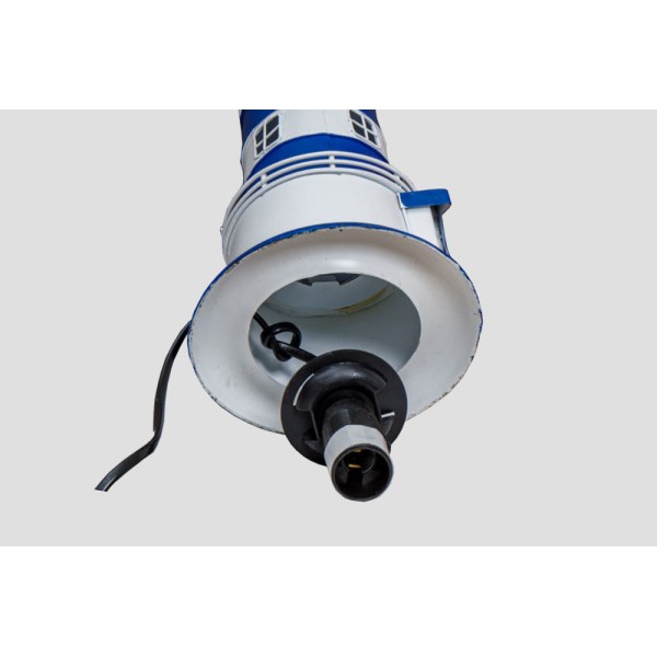 Blau-weiß gestreifter Metallscheinwerfer mit Beleuchtung. Die Scheinwerferfassung (E14) befindet sich unter dem Scheinwerfer. Diese Stirnlampe ist für die Verwendung in Innenräumen konzipiert und wird mit 220 V Strom betrieben. Die Kabellänge beträgt 1,5 m und es verfügt über einen Schalter zum Einschalten des Scheinwerferlichts.