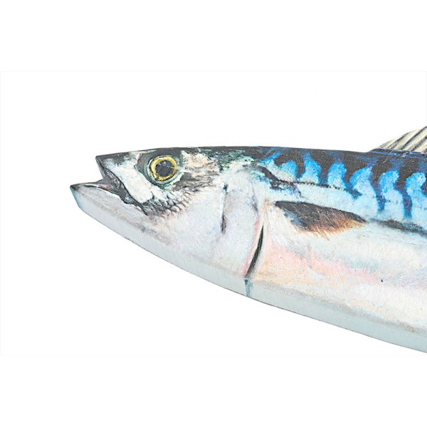 Wanddekoration mit Fischformen, handgefertigt aus Stahl und Holz.
