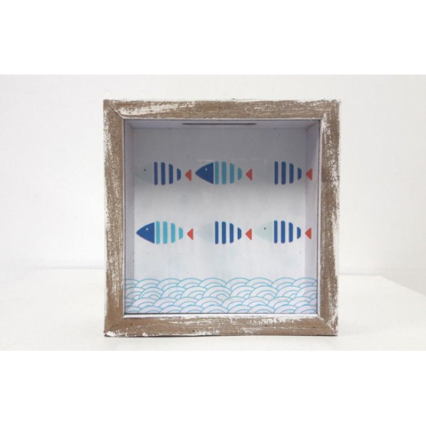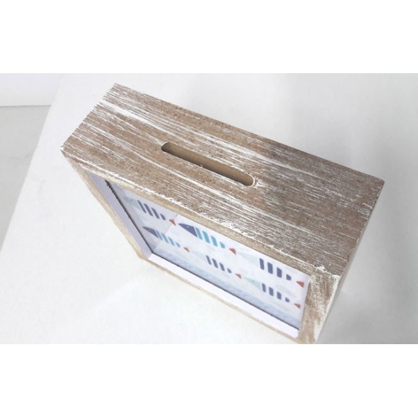 Handgemachtes Sparschwein aus Holz und Glas mit Zeichnungen von Walen.