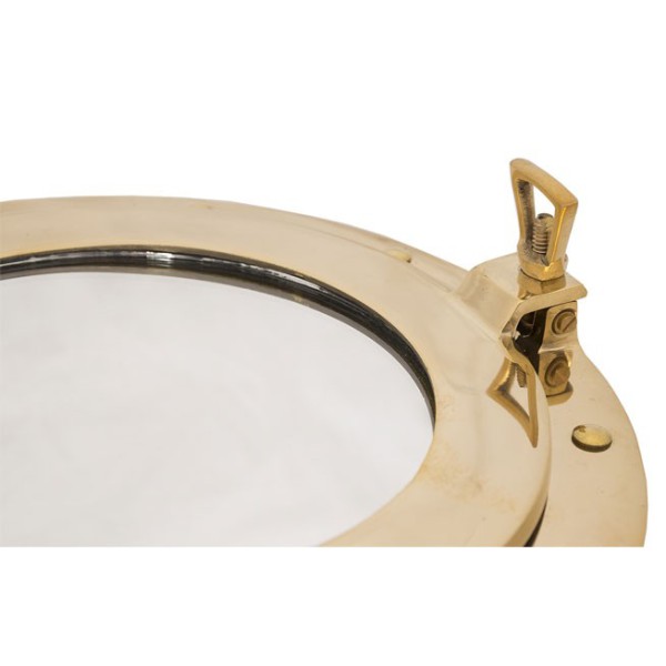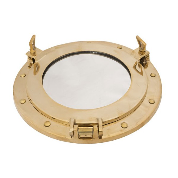 Bullauge mit Spiegel. Seedekor in hell poliertem Messing mit Scharnier.