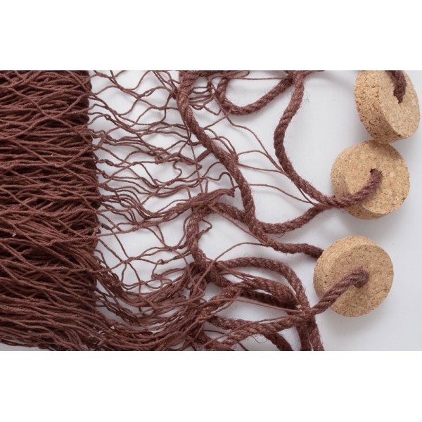 Fischernetz aus Baumwolle. Die Schwimmer sind an jedem Ende mit einem Hanfseil befestigt. Ein Deko-Objekt, das Meeresstimung schafft.