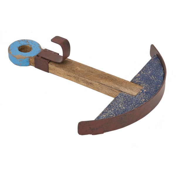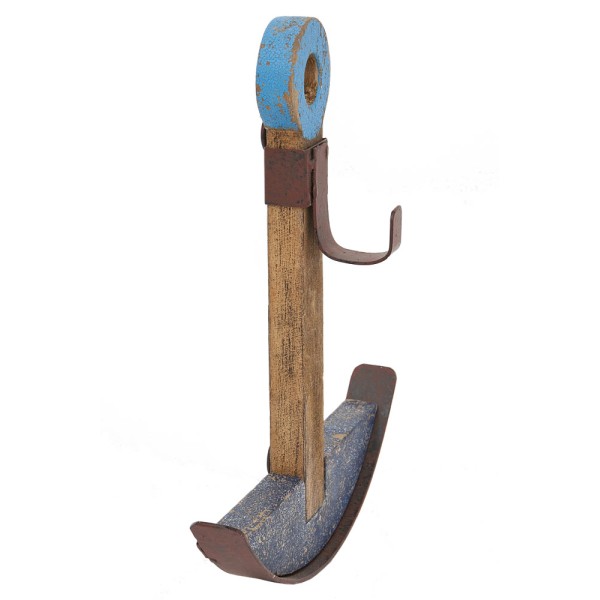 Kleiderhänger mit Holzsockel und Stahlbügel in Form eines Ankers.