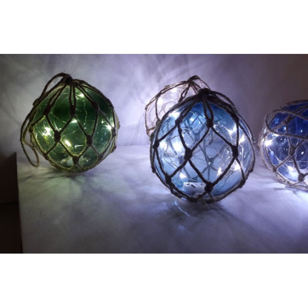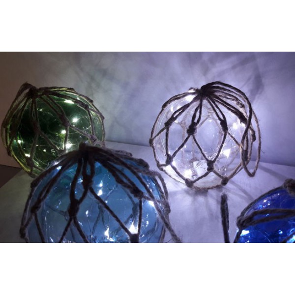 Set mit 4 Fischerbojen mit LED in verschiedenen Farben. Die Fischer-Boje war ein alter Schwimmer bestehend aus einer Glaskugel in einem geflochtenen Seil gewickelt. Diese Schwimmer wurden bis in die 50er Jahre verwendet . Sie wurden an die Fischernetze festgemacht damit sie an der Oberfläche blieben während sie vom Strom getrieben wurden. Ein Objekt, das ein dekorativer Meeres-Touch gibt.