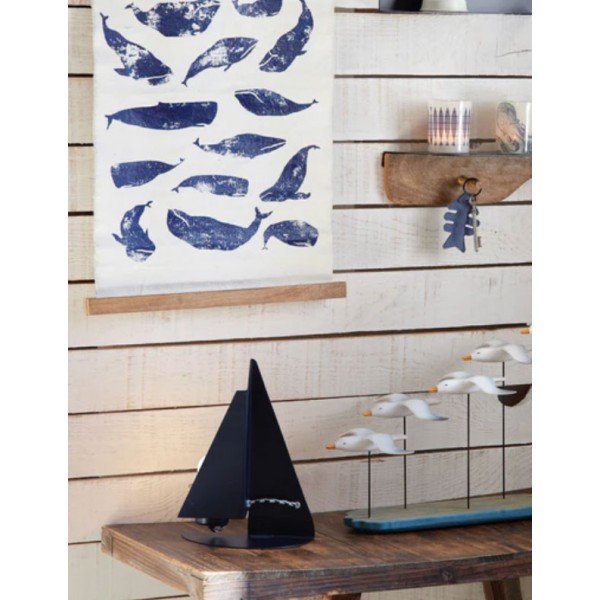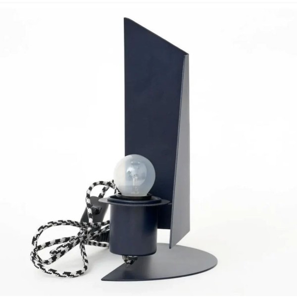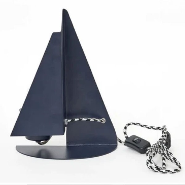 Blau lackierte Metalllampe in Form eines Segelboots. Sein Licht projiziert das Bild des Segelboots. E27-Glühbirne.