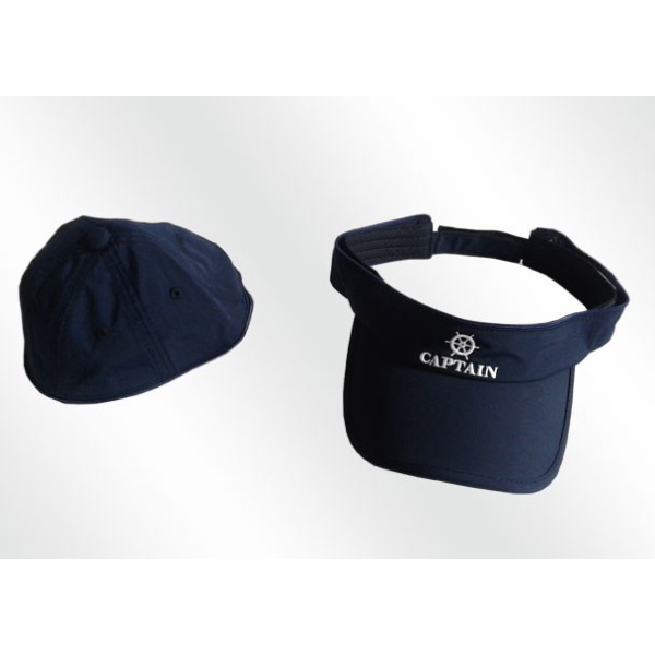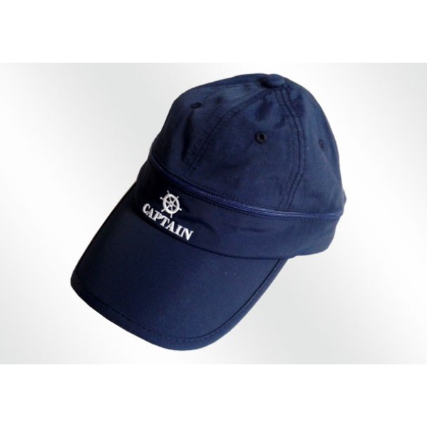 Kapitänsmütze in Blau mit gesticktem Kapitäns-Logo in Weiß. Mit Lüftungsschlitzen entworfen zur Belüftung des Kopfes. Es hat auch ein Reissverschlus, um die Oberseite der Mütze zu entfernen und als Visier zu fungieren. In der Hinterseite verstellbar.