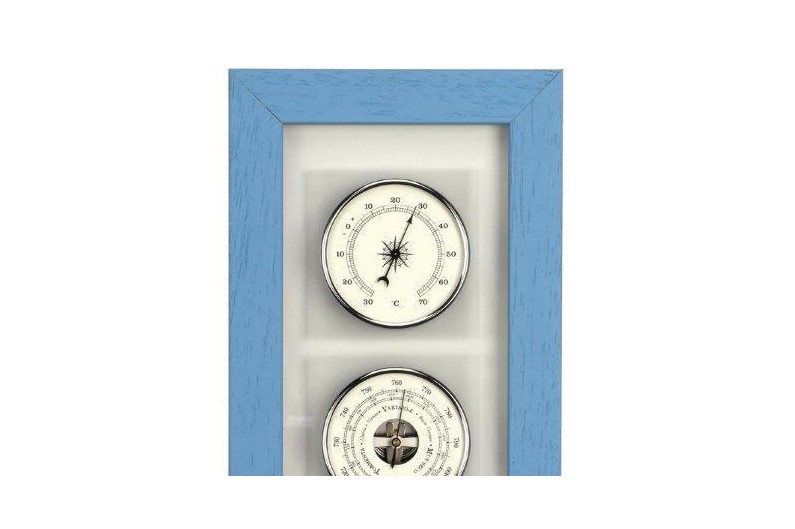 Wetterstation. Informiert über Feuchtigkeit, Luftdruck und Temperatur. Kann eine einfache Wettervorsage für jeden Seemann hergeben. Sie ist auf einem Holzrahmen befestigt.