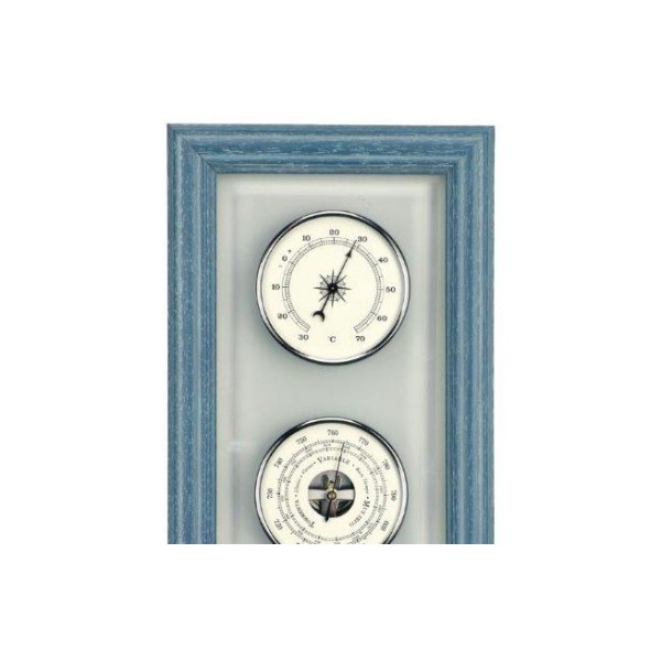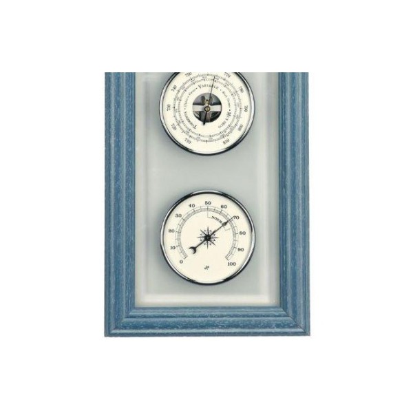 Wetterstation. Informiert über Feuchtigkeit, Luftdruck und Temperatur. Kann eine einfache Wettervorsage für jeden Seemann hergeben. Sie ist auf einem Holzrahmen befestigt.