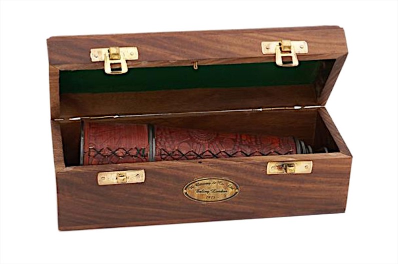 Schöne Replik eines alten Fernrohrs, aus Bronze, mit einer besonderen Behandlung. Kommt in einer Holzkiste , auf der Innenseite ausgekleidet, mit einem Anker dekoriert. Der erweiterte Fernglas ist 59 cm lang. Funktioniert perfekt, aber seine Verwendung sollte rein dekorativ sein.