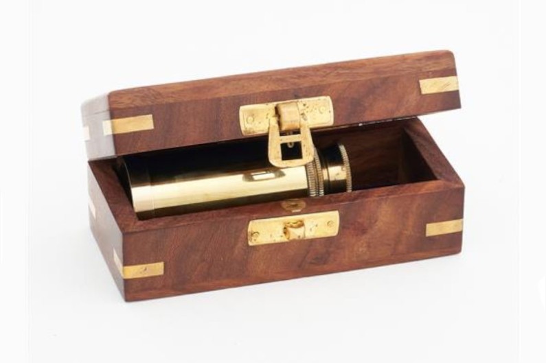 Schöne Replik eines alten Fernrohrs, aus Bronze, mit einer besonderen Behandlung. Kommt in einer Holzkiste , auf der Innenseite ausgekleidet, mit einem Anker dekoriert. Der erweiterte Fernglas ist 17 cm lang. Funktioniert perfekt, aber seine Verwendung sollte rein dekorativ sein.