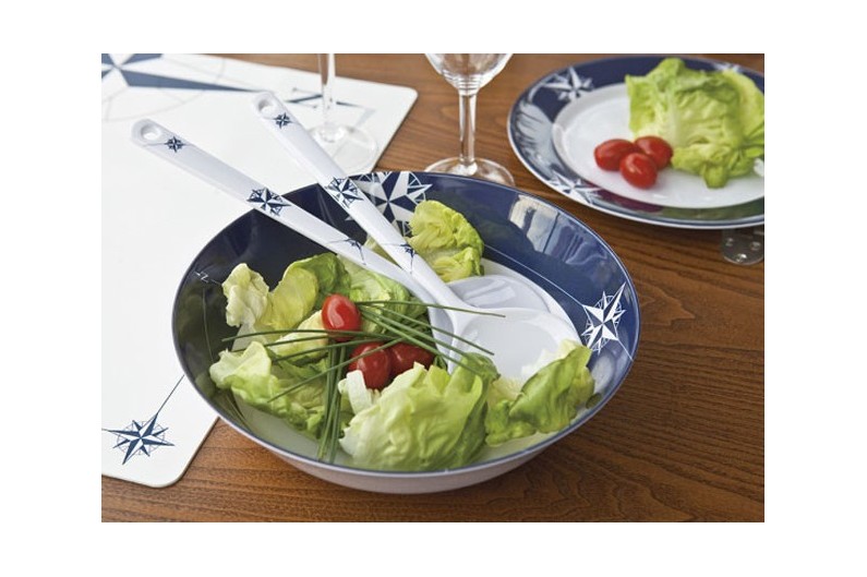 Salatschüssel mit Besteck, wunderschönes Design, mit weißen und blauen Hintergrund.