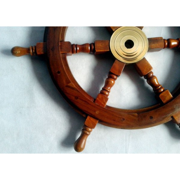 Handwerkliche Reproduktion eines Steuerruders, von grossen Segelschifffen im 19. Jahrhundert benutzt. Dekoratives Steuerruder mit acht Armen aus Palisanderholz mit der zentralen Nabe aus Messing.