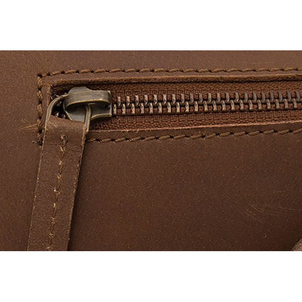 Großes Format und aus Leder gemacht. Es hat eine Innentasche mit Reißverschluss.