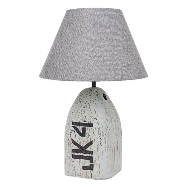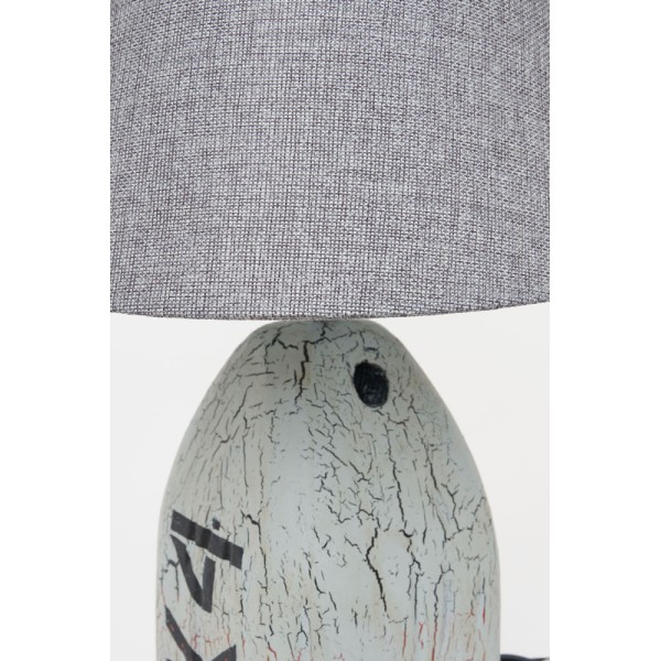 Bojengraue Tischlampe mit durchscheinendem Stoffschirm.