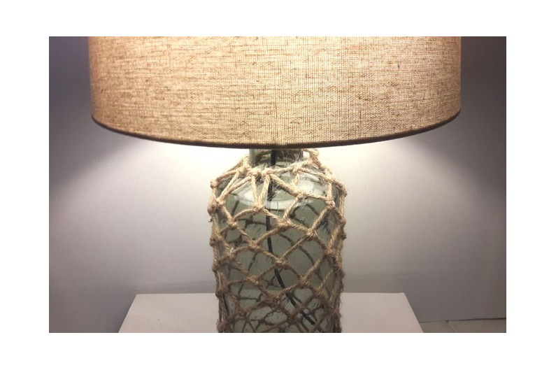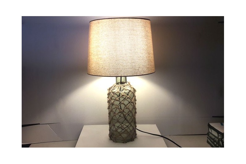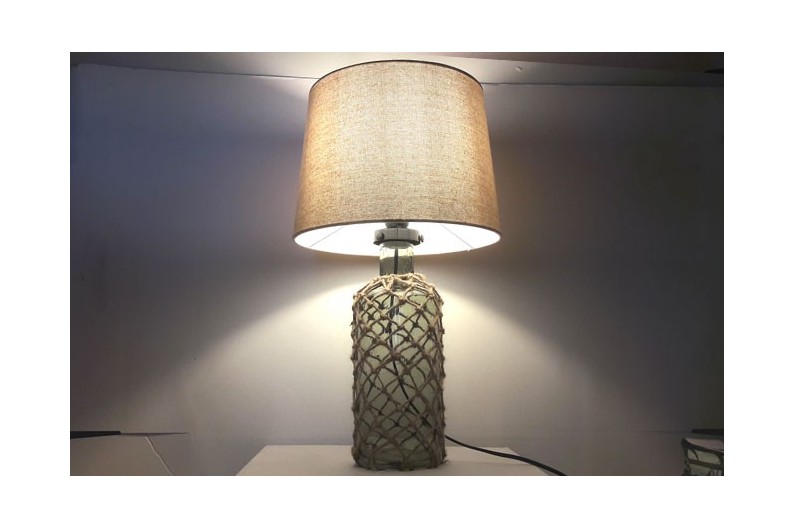 Dekorative Glasflasche Lampe in grünen farbe und Lampenschirm aus durchscheinend Stoff. E27 Birne. Flaschendurchmesser: 14 cm Fotografien mit Led-Glühbirne von 4w und 2700K gemacht