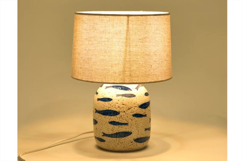 Weiße Terrakottalampe mit aufgedruckten blauen Fisch, Tischlampe mit durchscheinendem Stoffschirm.