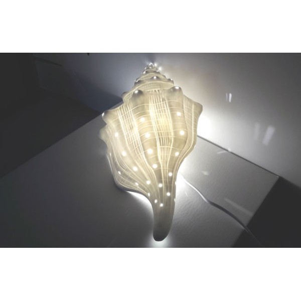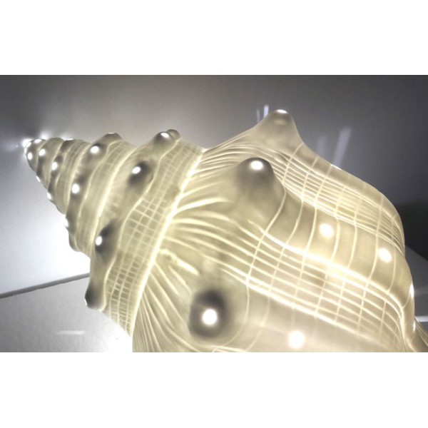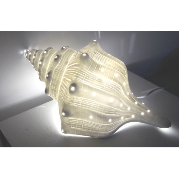 Meeresschnecke-Lampe aus durchscheinendem Porzellan. Schöne Lampe, die ein warmes Licht gibt, ideal für eine gemütliche und entspannende Stimmung.