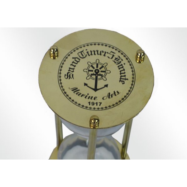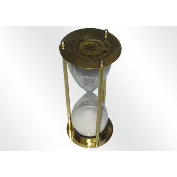 Schöne Nachbildung einer Sanduhr, aus poliertem Messing, mit weißem Sand und 5 Minuten Dauer. Sein Gebrauch soll rein dekorativ sein.