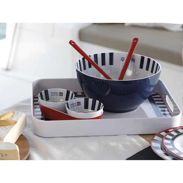 Rechteckiges Tablett mit schönem Design, mit weißem Hintergrund und blauen und roten Streifen.