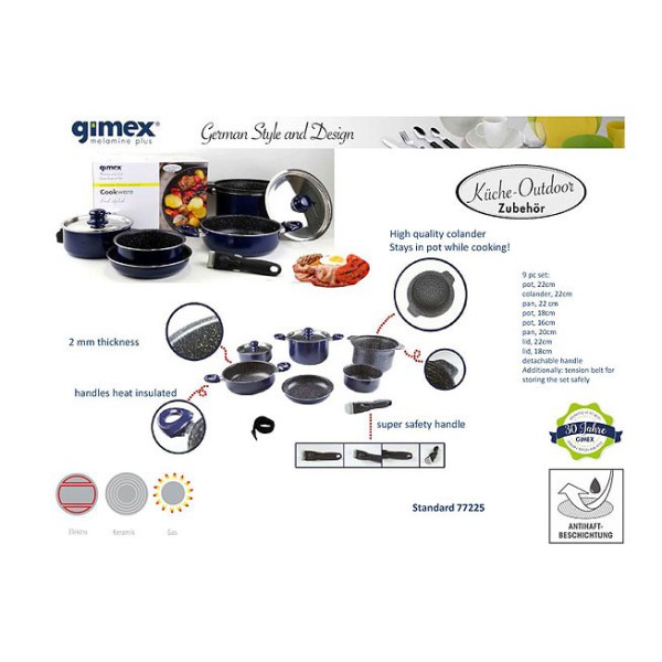 Hochwertiges Kochset aus leichtem Aluminium mit Antihaftbeschichtung. Alle Artikel sind aus mind. 2 mm dickem Material und hochwertig verarbeitet. Der abnehmbare Griff hat eine Sicherheitsverriegelung, um ungewolltes Öffnen zu verhindern, der Marke GIMEX.